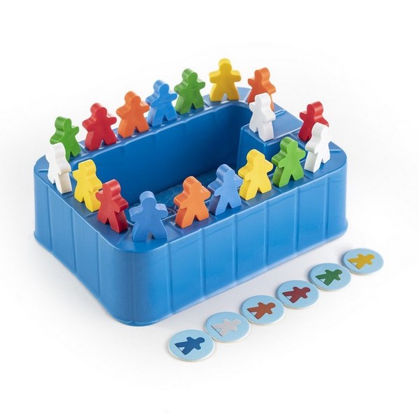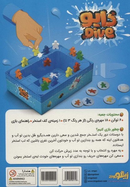 بسته بازی دایو (بقیه رو بنداز تو آب!)،(باجعبه)(مناسب بالای 7 سال،حاوی:6توکن،18مهره ی رنگی (از هر رنگ 3تا،1 زمینه ی کف استخر،راهنمای بازی،مناسب برای 2تا6 نفر،مدت زمان:10دقیقه،باجعبه)